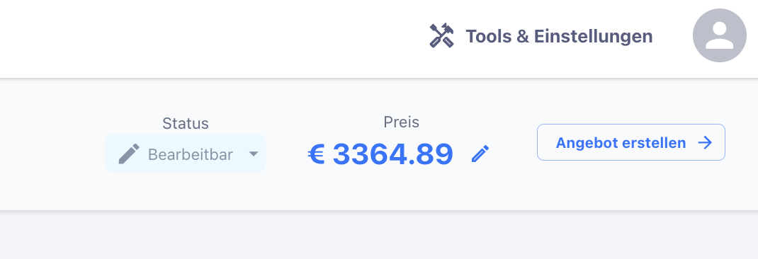 Sobald ein Kunde in der Kalkulation hinterlegt ist, erscheint im oberen rechten Bereich der Kalkulationsübersicht der Button „Angebot erstellen“. Mit einem Klick darauf gelangen Sie in den Angebotseditor, in dem sämtliche Daten aus drei Quellen zusammengeführt werden: