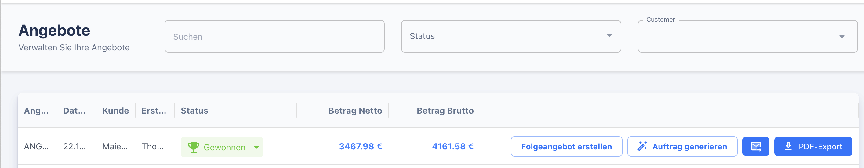 Ein Auftrag kann immer nur aus einem gewonnenen Angebot erstellt werden. Um einen Auftrag anzulegen, setzen Sie zunächst den Status eines Angebots auf Gewonnen. Daraufhin erscheint in der Angebotsübersicht der Button Auftrag generieren. Mit einem Klick darauf werden Sie direkt zum Auftragseditor weitergeleitet, um den neuen Auftrag zu verwalten.