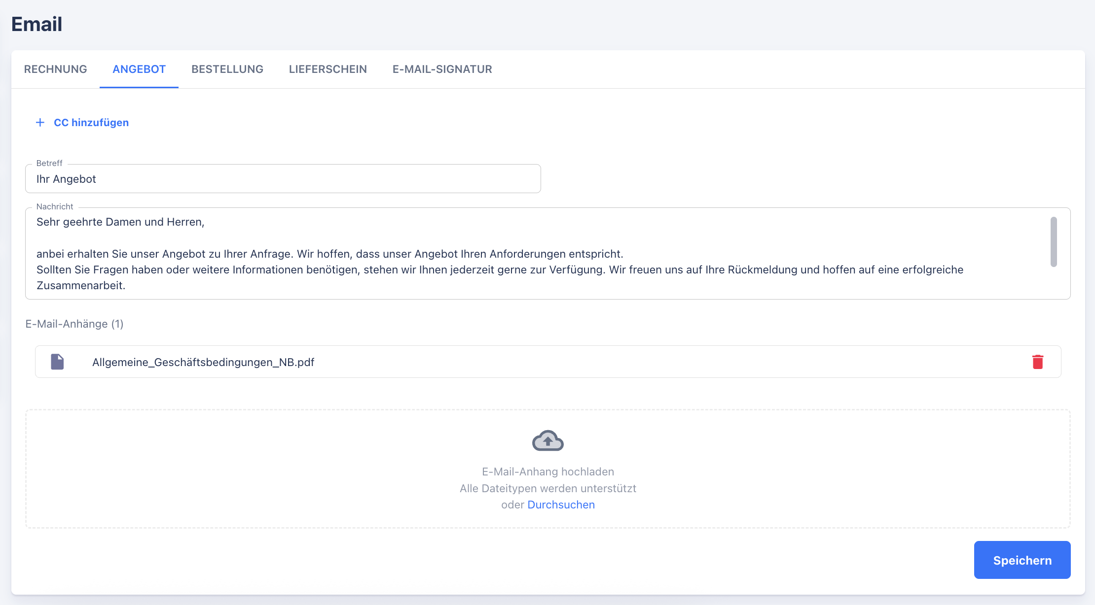Auf diese Weise lässt sich beispielsweise festlegen, dass bei jedem Angebot automatisch eine bestimmte Begleitnachricht verwendet wird, bei jeder Rechnung die Buchhaltung als CC-Empfänger hinzugefügt wird oder dass bei jeder Bestellung ein zusätzliches Informationsblatt angehängt wird.