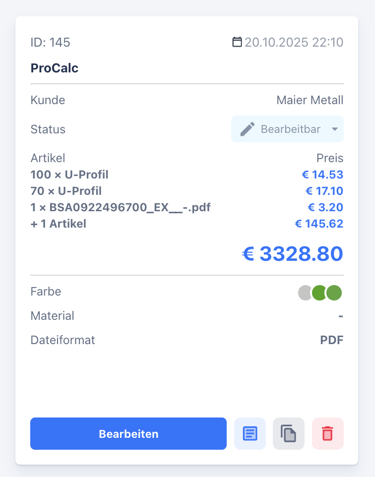 Die Karten sind so gestaltet, dass alle relevanten Informationen schnell erkennbar sind, ohne die Kalkulation öffnen zu müssen.
