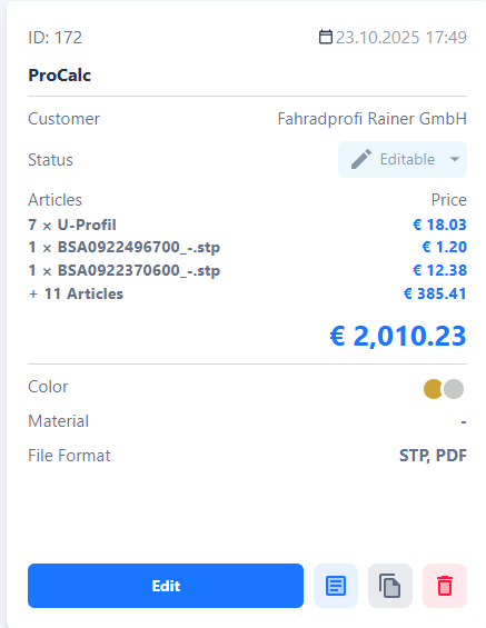 The cards are designed so that all relevant information can be quickly recognized without having to open the calculation.