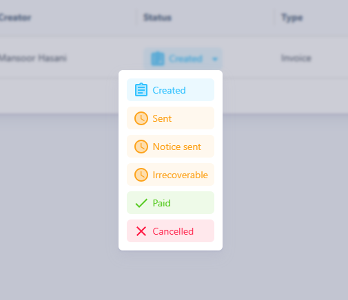 To cancel an invoice, select “canceled” in the Status field. A confirmation dialog will then appear, where you must confirm the action. The cancellation is only executed after this confirmation.