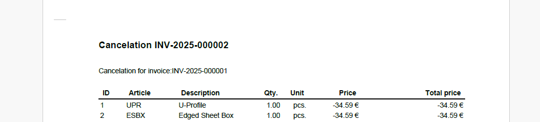 This cancellation invoice is assigned a consecutive invoice number within the same numbering sequence as regular invoices. It contains all items from the original invoice, but with negative amounts so that the total cancels out the previously billed amount. The generated PDF also automatically includes the note: "Cancellation Invoice for Invoice: [Original Invoice Number]".