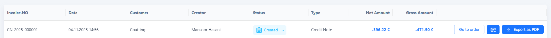 By clicking on “Create Credit Note,” the Credit Note Editor opens, which in structure and functionality is identical to the Invoice Editor.