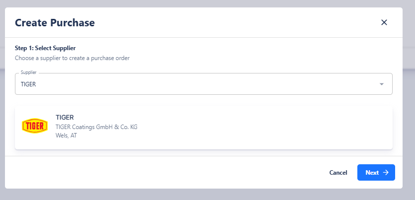 In the first step, select the desired supplier. The list of available suppliers is based on the entries you previously created in Supplier Management. Once you select a supplier, their articles will automatically become available in the next step.