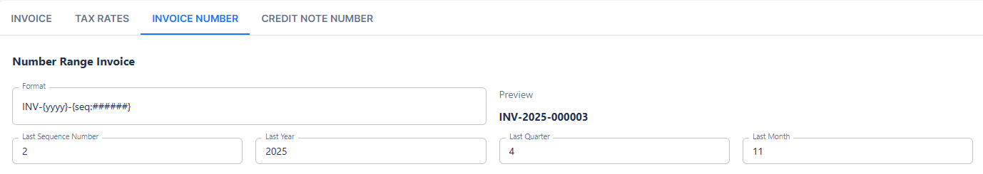 Here you define the invoice numbering series. You can customize the invoice number format and use placeholders. The page displays a preview of the next number to be assigned. For mid-year changes, you can set the last issued sequence number so that numbering remains continuous.