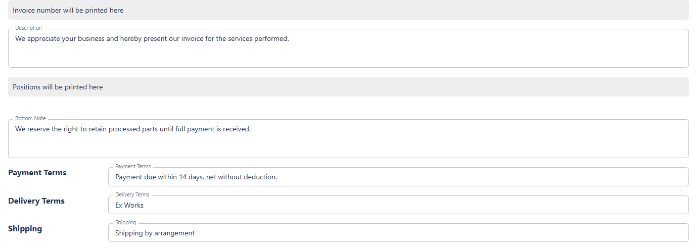 Positions: Standard positions can be automatically added from the document definition. They can be edited or deleted in the invoice editor if needed.