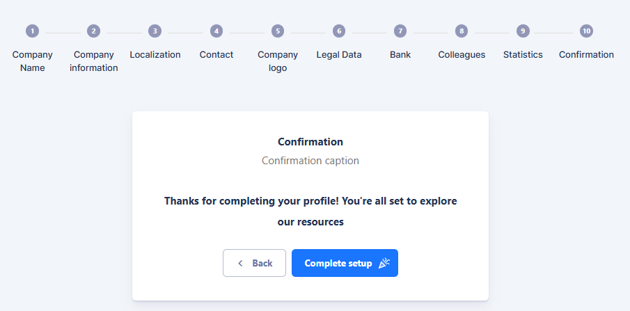 After successful registration and the first login, the user is automatically guided through the setup process. The goal of this step is to fully configure the company profile so that Surface Solutions can correctly configure all functions and documents. The setup process consists of ten consecutive steps in which all relevant company information is collected.