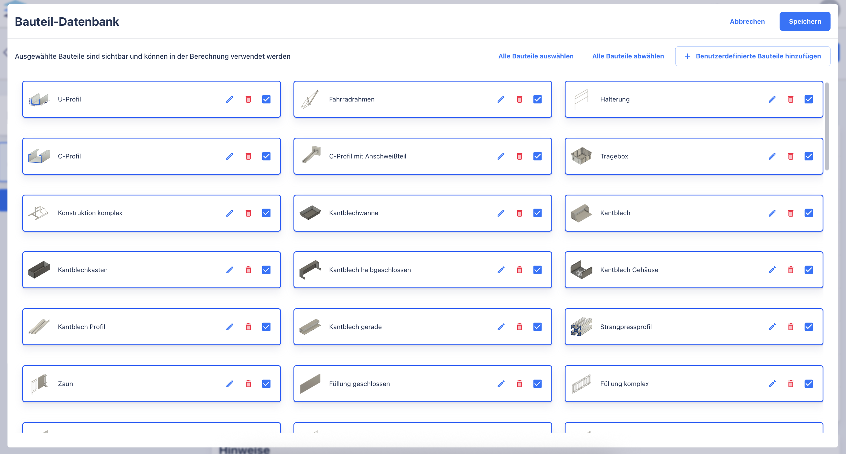 The database contains both pre-made standard items and custom items created by you. Each item can be individually customized, including its name, article number, image, and visibility. Using the visibility checkbox, items can be hidden if needed, so they do not appear in the Calculation Editor.