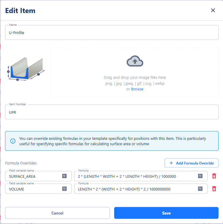 Once an item is assigned to a position, the formula override is applied automatically if it exists. Otherwise, the standard formula from the template is used. This allows you to perform individual calculations for different items without having to adjust the template for all positions.