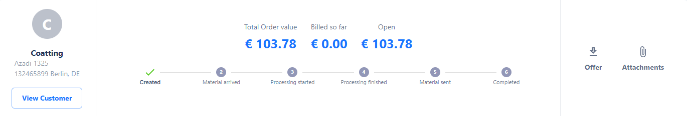 At the top of the editor, you can see the customer, the total net order value, the positions already invoiced, and the open amount — which represents the difference between the total order value and the amounts already billed. You can also navigate directly to the associated offer or add attachments to the order — either for individual positions or for the entire order. Material requirements and notes can likewise be managed directly within the order.