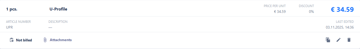 For each position, the following information is displayed: quantity, name, unit price, discount, total price, item number, description, and attachments. Positions can be duplicated to quickly create similar items.