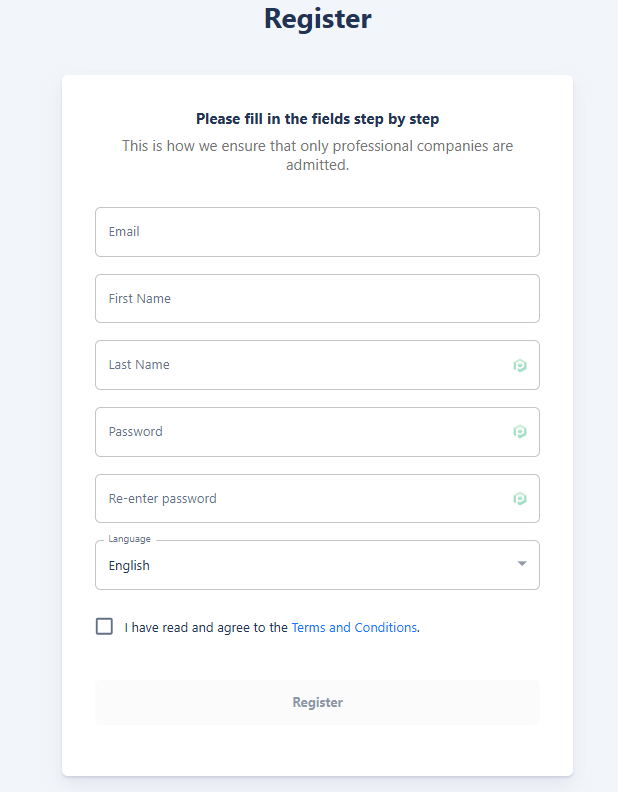 The selection of the language is particularly important, as it defines the organization language. It determines the language used for default texts in calculations, offers, invoices, and other documents. Changing the organization's language afterwards is only possible via the support team. The user interface language, however, can be customized individually by each user.